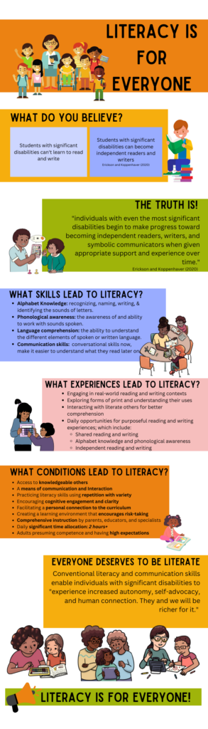 Learning Objective: Engage with theories and practices related to Literacy for Everyone and AAC technology to promote literacy skills and self-expression in person and through digital mediums.